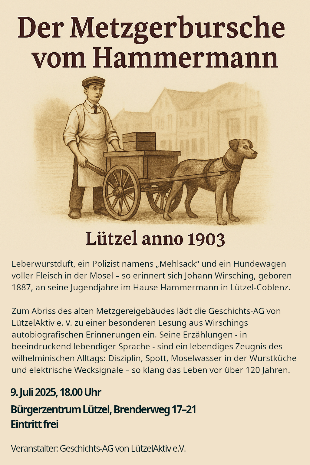 Am 9.7.2025 lasen wir aus den Erinnerungen eines Metzgerburschen in Lützelcoblenz. Eine zweite Lesung ist für das Wochenende am 16.11.2025 auf dem Lützeler Geschichtsfest geplant.